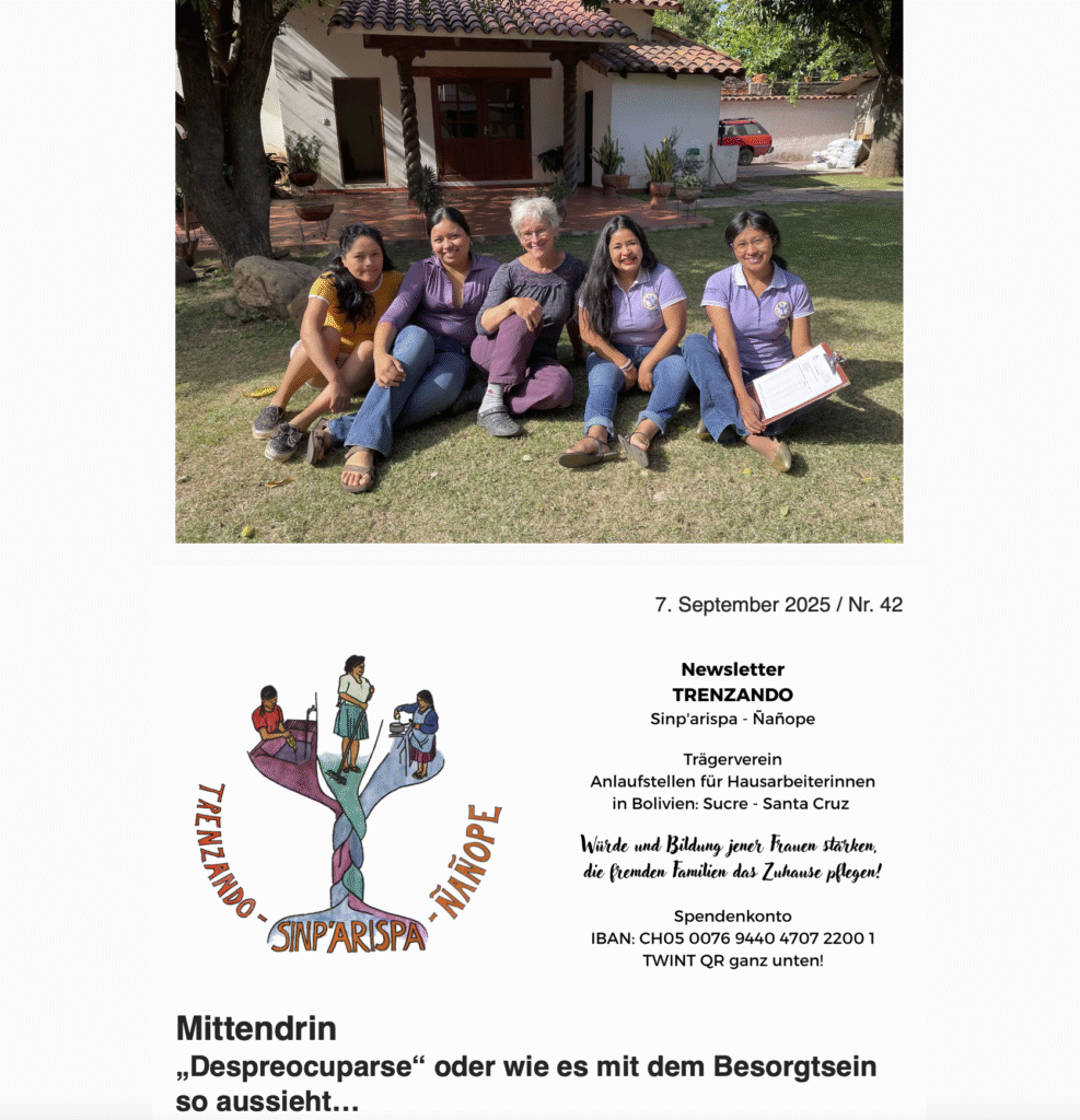 In unregelmässigen Abständen berichte ich über Neuigkeiten aus Bolivien in den beiden Anlaufstellen SINP’ARISPA (Sucre) und ÑAÑOPE (Santa Cruz), die zu TRENZANDO gehören. Manchmal reise ich auch hin, um die Anlaufstellen direkt vor Ort zu beraten und zu betreuen. Über Veranstaltungen, mit der Ausstellung mit meinem Erzählbildband Unsere Kraft möchte ich Menschen in Europa und in Bolivien berühren und bewegen und für die Fragen um Würde und Hausarbeit, indigene Kultur und Frauenrechte sensibilisieren.